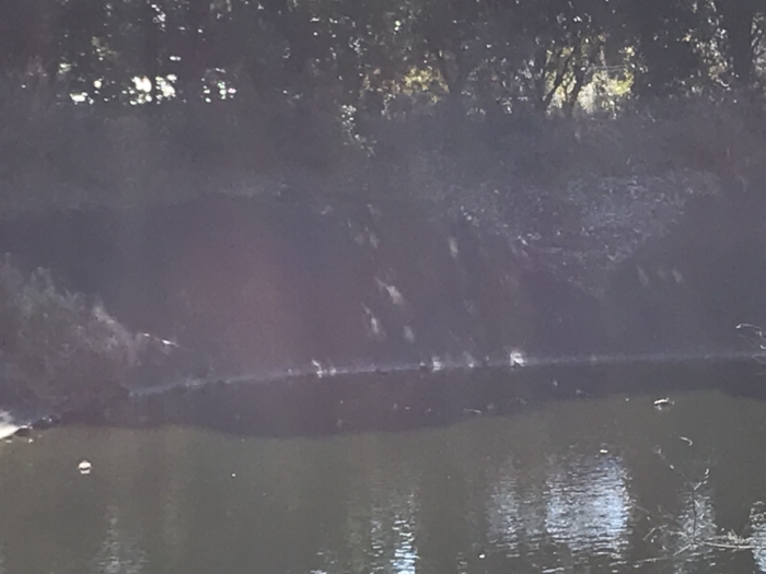 分かりづらいけど、コンクリートの岸壁にポチポチ鴨が休んでいます。